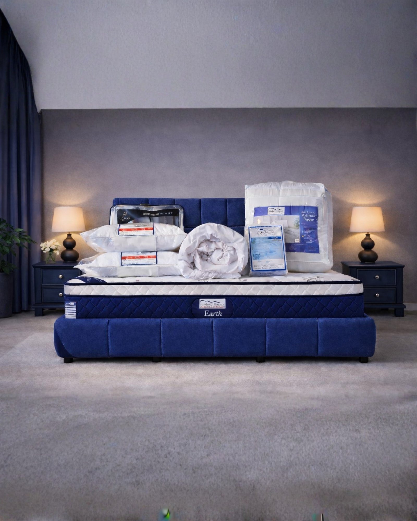 بكج فاخر لمن يبحث عن أعلى مستوى من الراحة والدعم. يجمع مرتبة قوية للأوزان العالية مع واقي مرتبة، وسائد طبية قطنية، ومفرش فندقي كامل. تجربة نوم ملكية جاهزة من أول يوم.