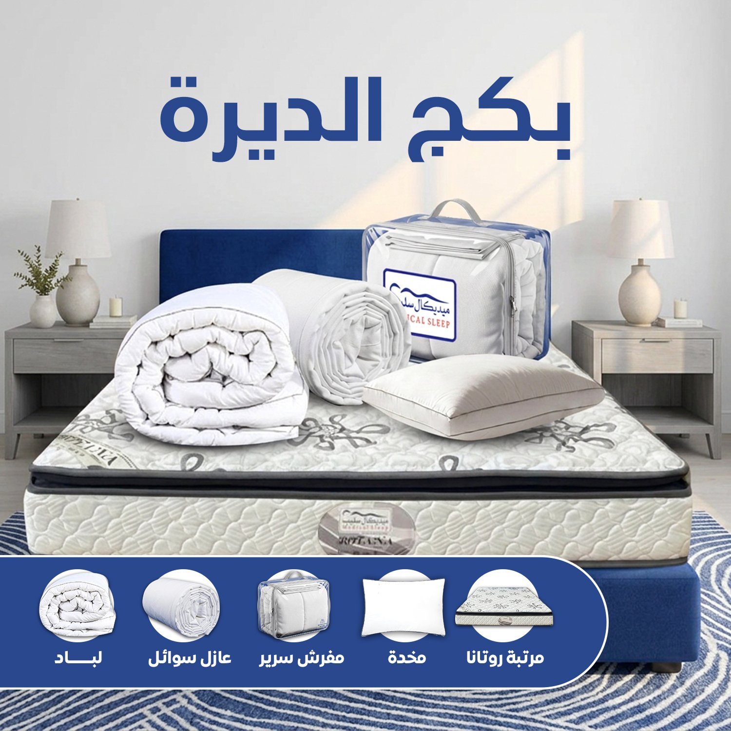 غرفة نومك تتحول لجناح ملكي! بكج يضم كل ما تحتاجه: مرتبة روتانا الداعمة للظهر، ومفرش 7 قطع فاخر. يأتي مع هدايا الراحة: لباد مرتبة وعازل حماية، و 4 مخدات بريم.